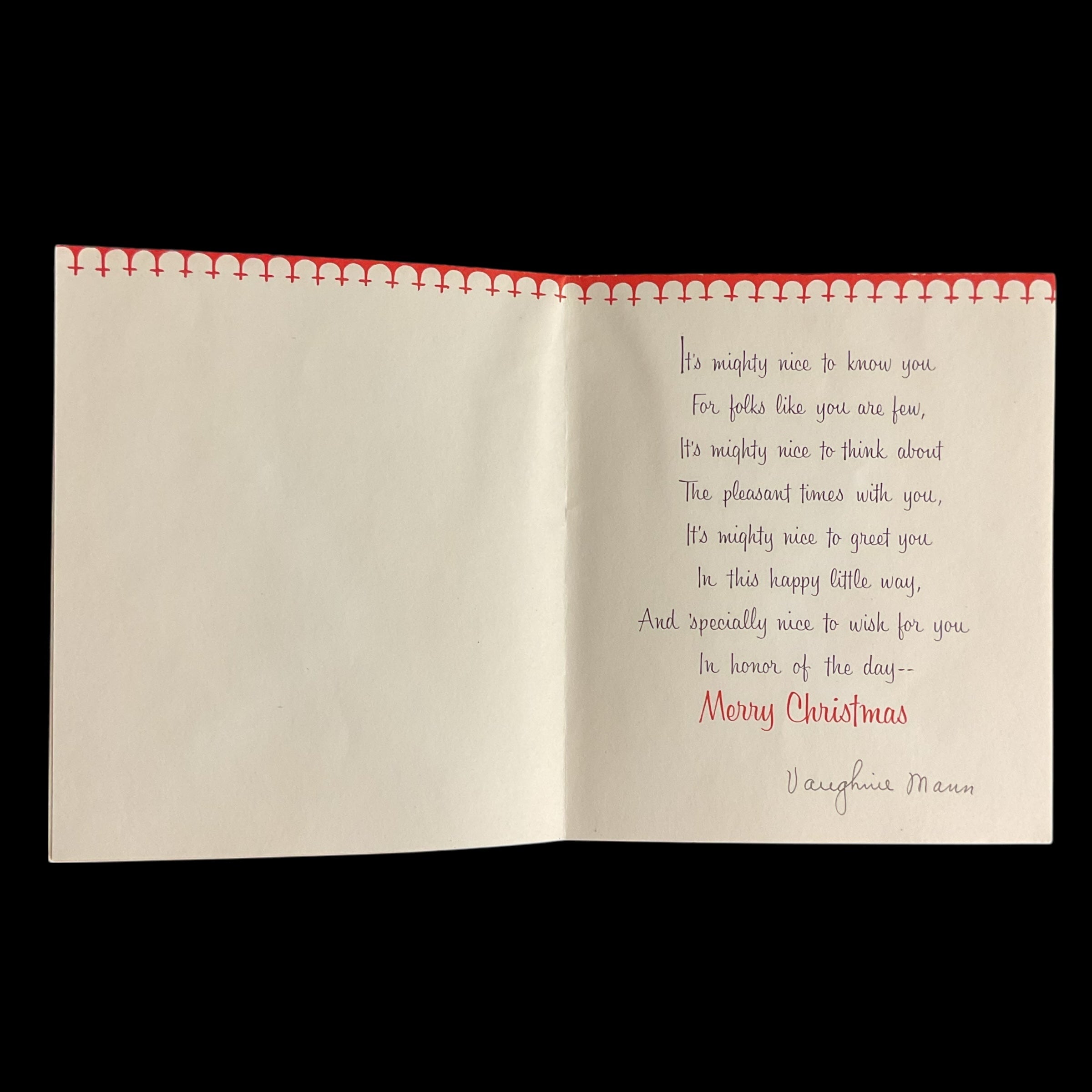 Vintage 1950s Christmas Greeting Card. Features a snowy Christmas scene.