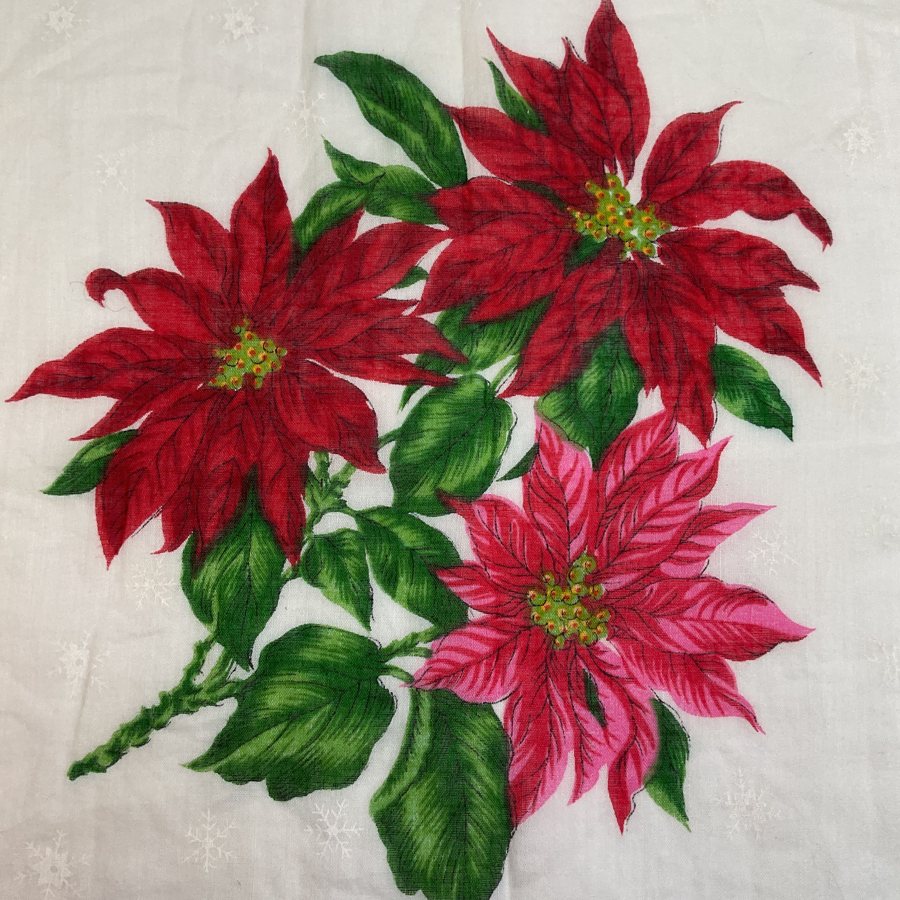 Beautiful vintage Christmas hanky featuring a red and pink Poinsettia border and a large spray of pink and red Poinsettias at the center on a white background.
