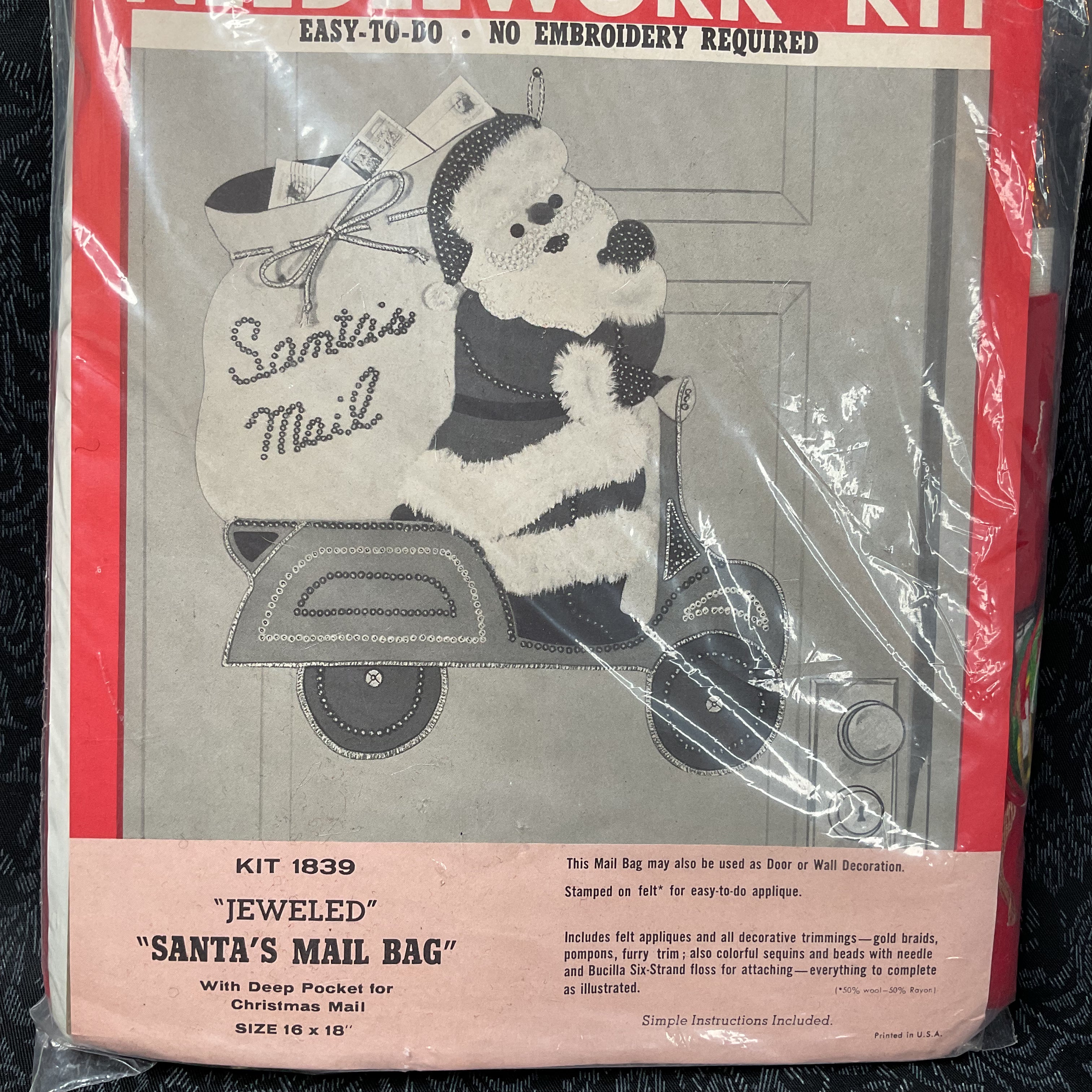 Vintage 1960s Bucilla Christmas Needlework Kit #1839. Jeweled Santa’s Mail Bag with Deep Pocket for Christmas Mail. Size 16 x 18 inches.