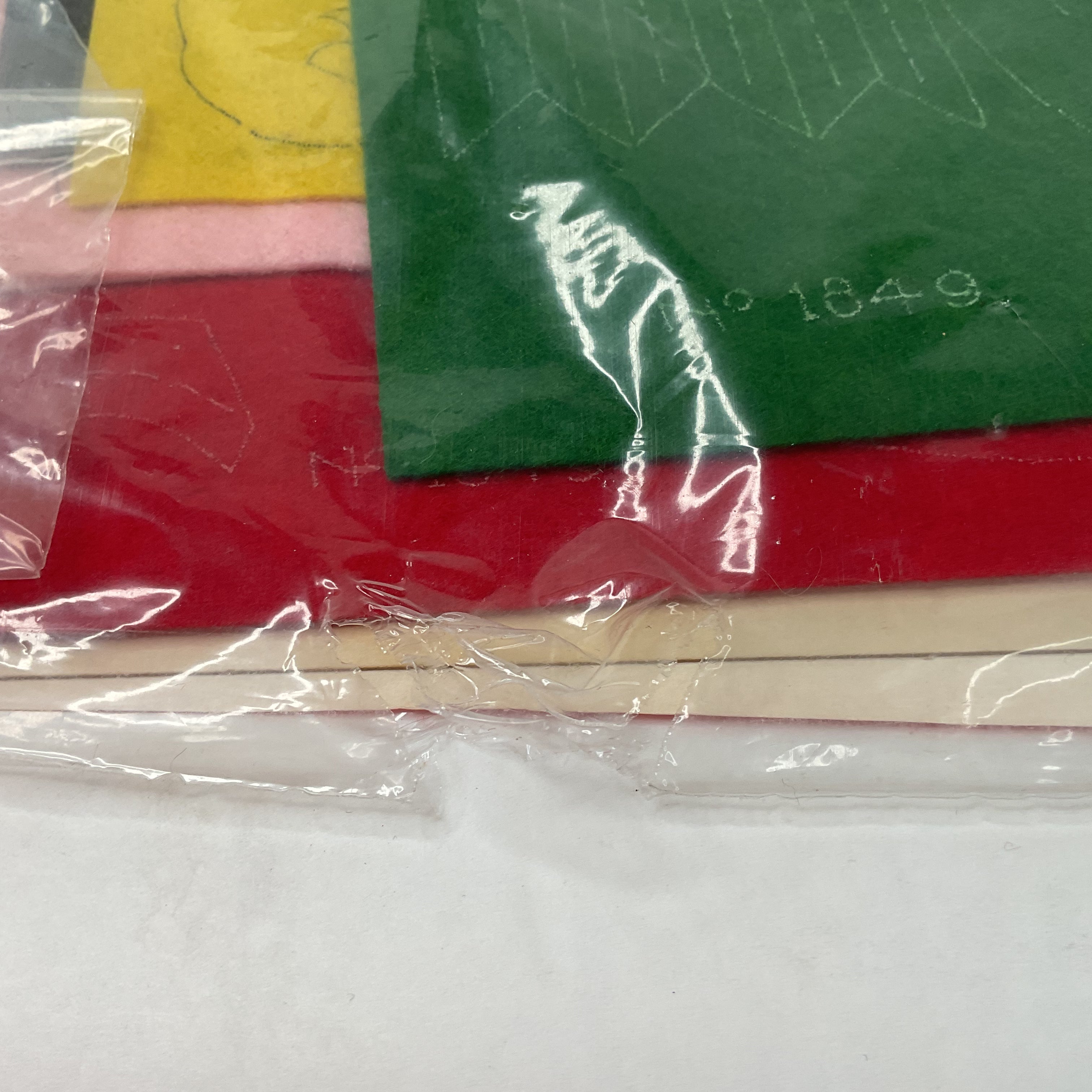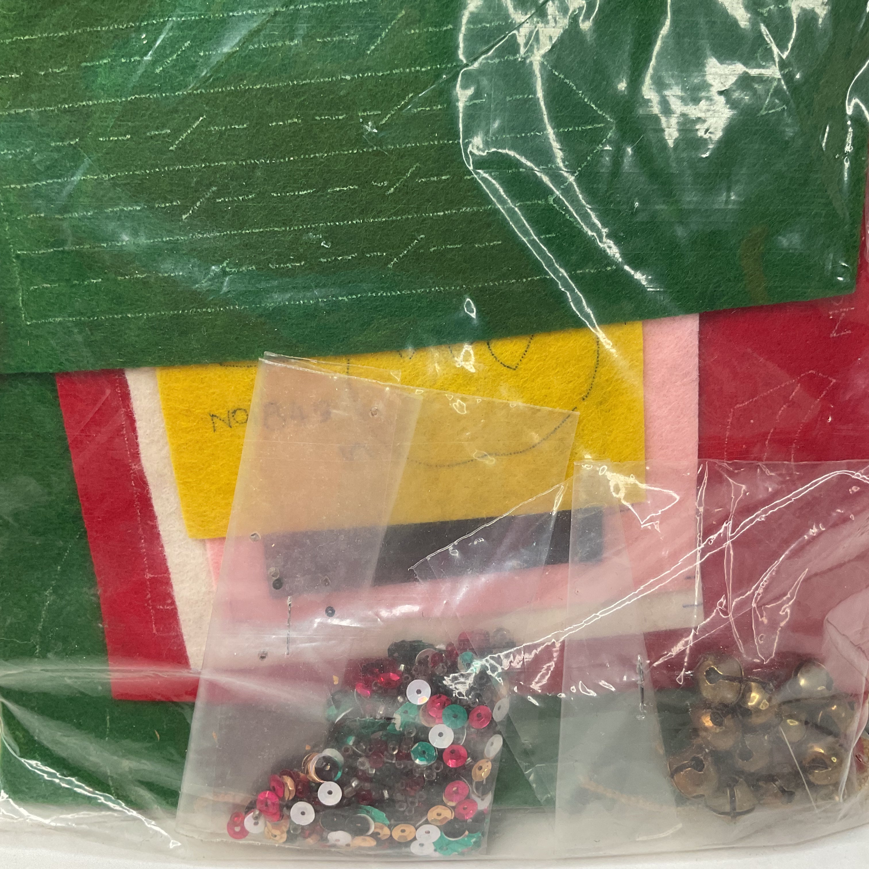 Sealed kit that includes felt appliqués and all decorative trimmings. Gold braids, pompons, furry trim; also colorful sequins and beads with needle and Bucilla Six Strand floss for attaching.