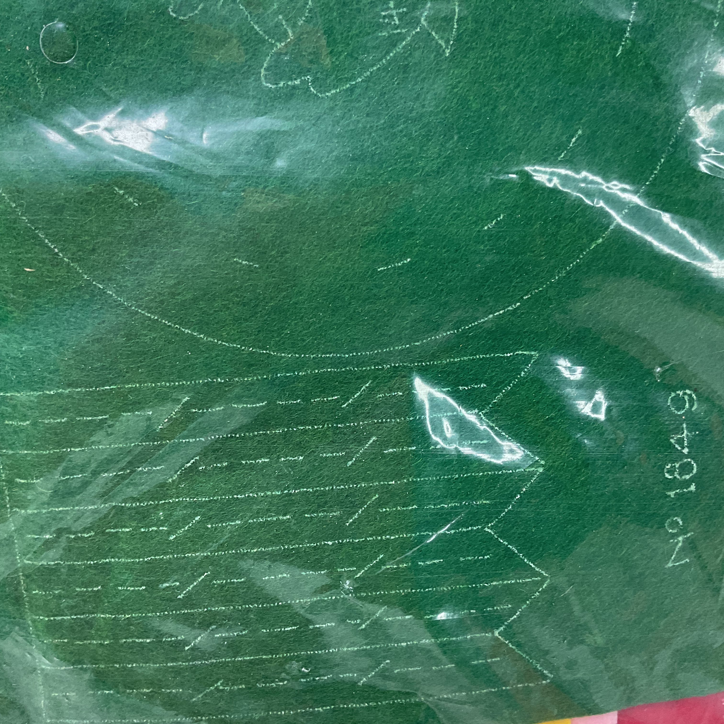 Felt face, eyes and hat. Fringe beard and sequined mustache.