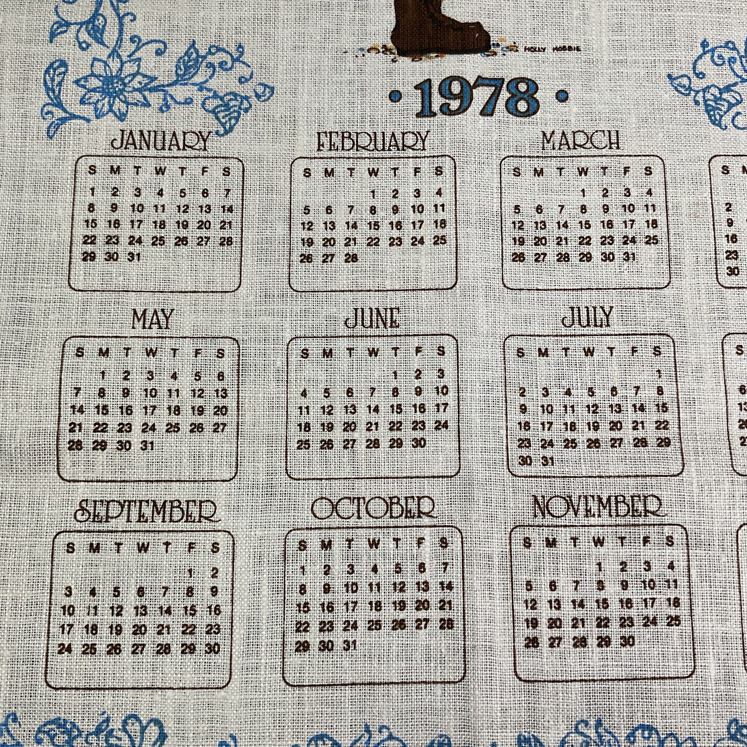 Shows the twelve months of the year for 1978 in black lettering with a blue outer border around the entire towel.