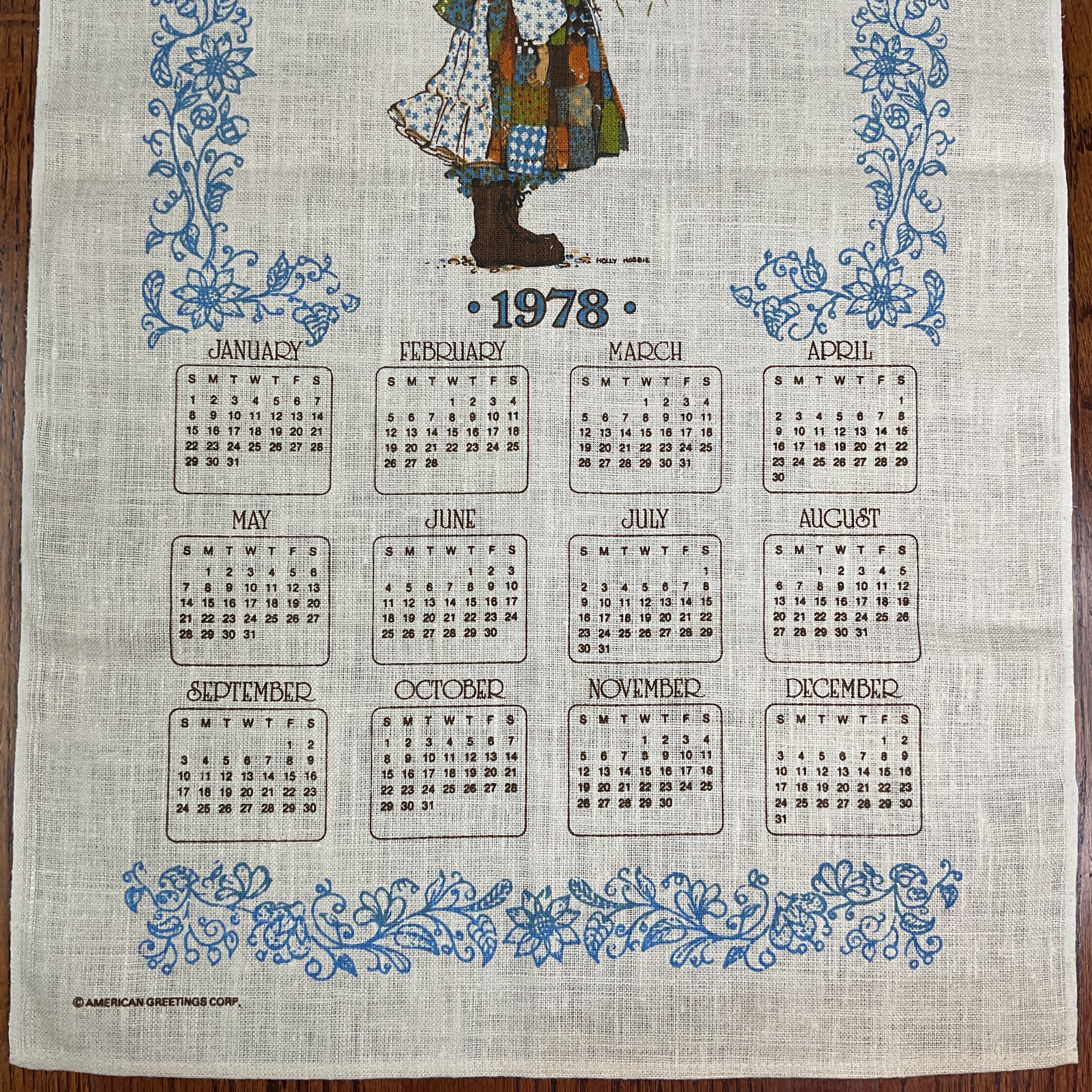 Vintage 1978 Holly Hobbie Calendar Linen Tea Towel.