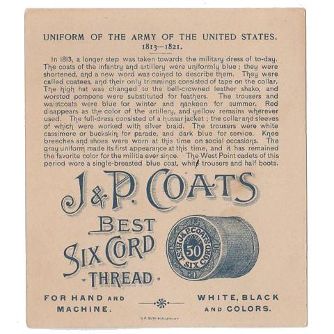 J & P Coats Antique Trade Card Uniform Military Series U.S. Army 1813-1821 Infantry