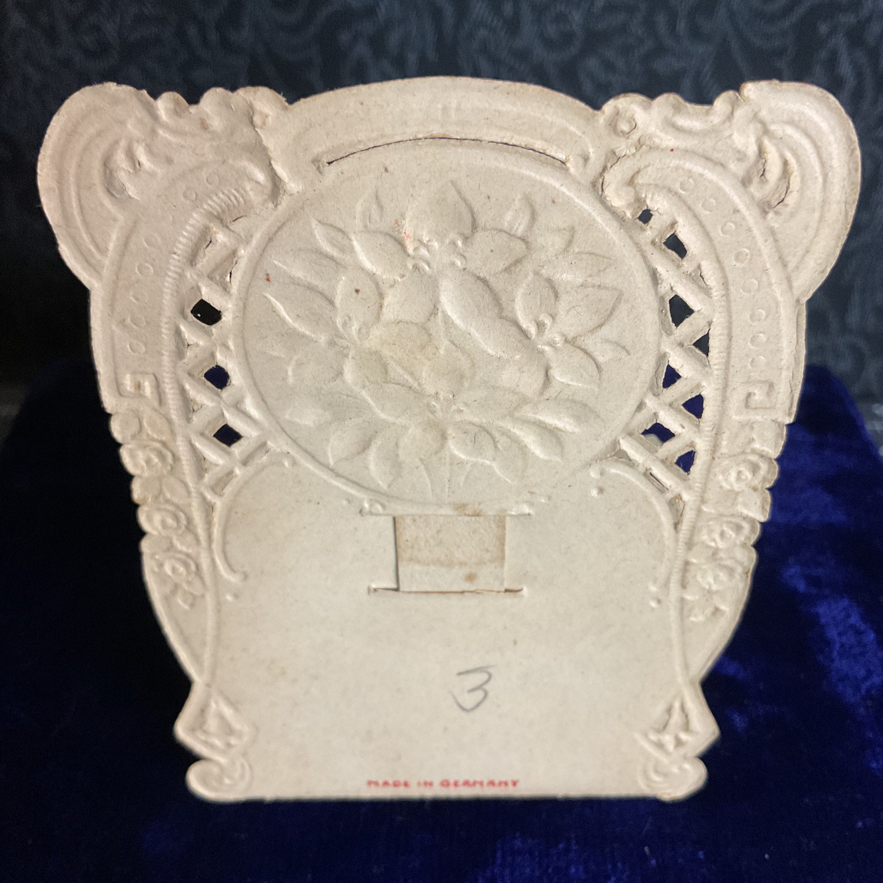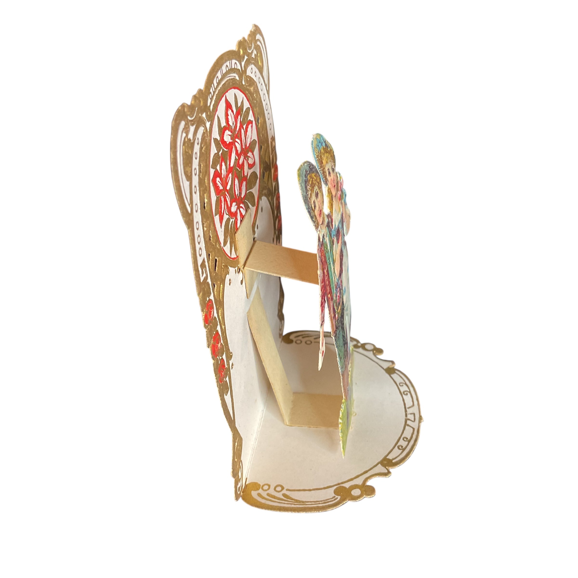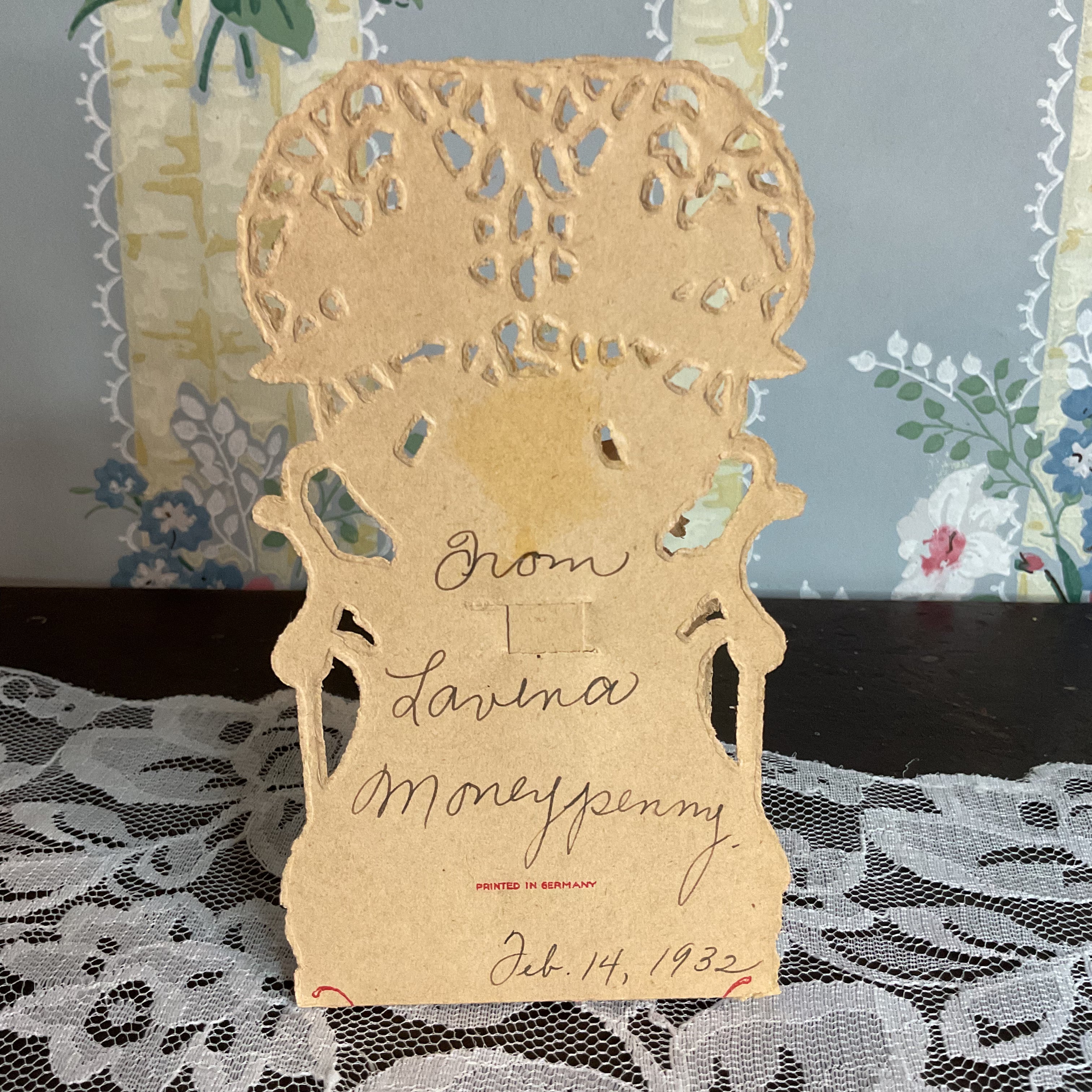 Vintage original circa 1930s die cut embossed 3D pop up Valentine Card. Features a young boy and girl. Boy is holding an envelope with a red heart on the cover.