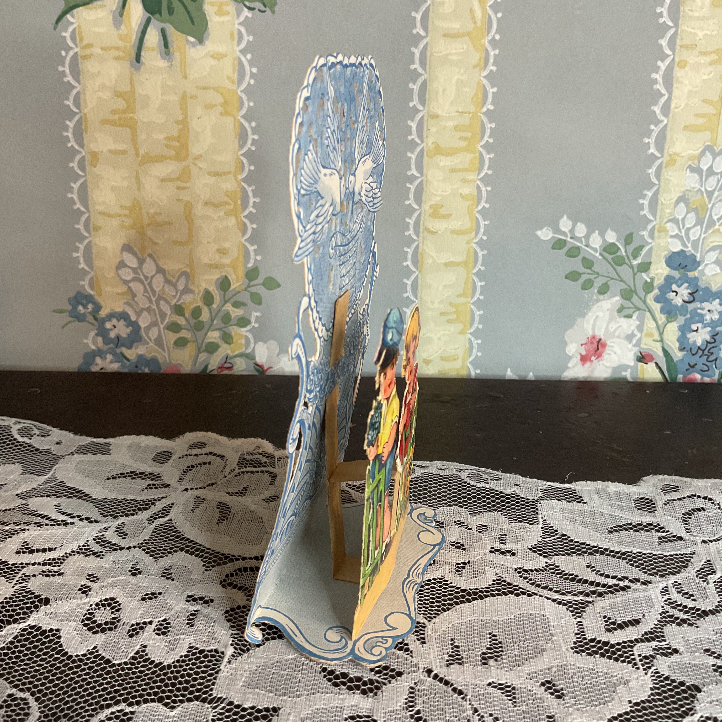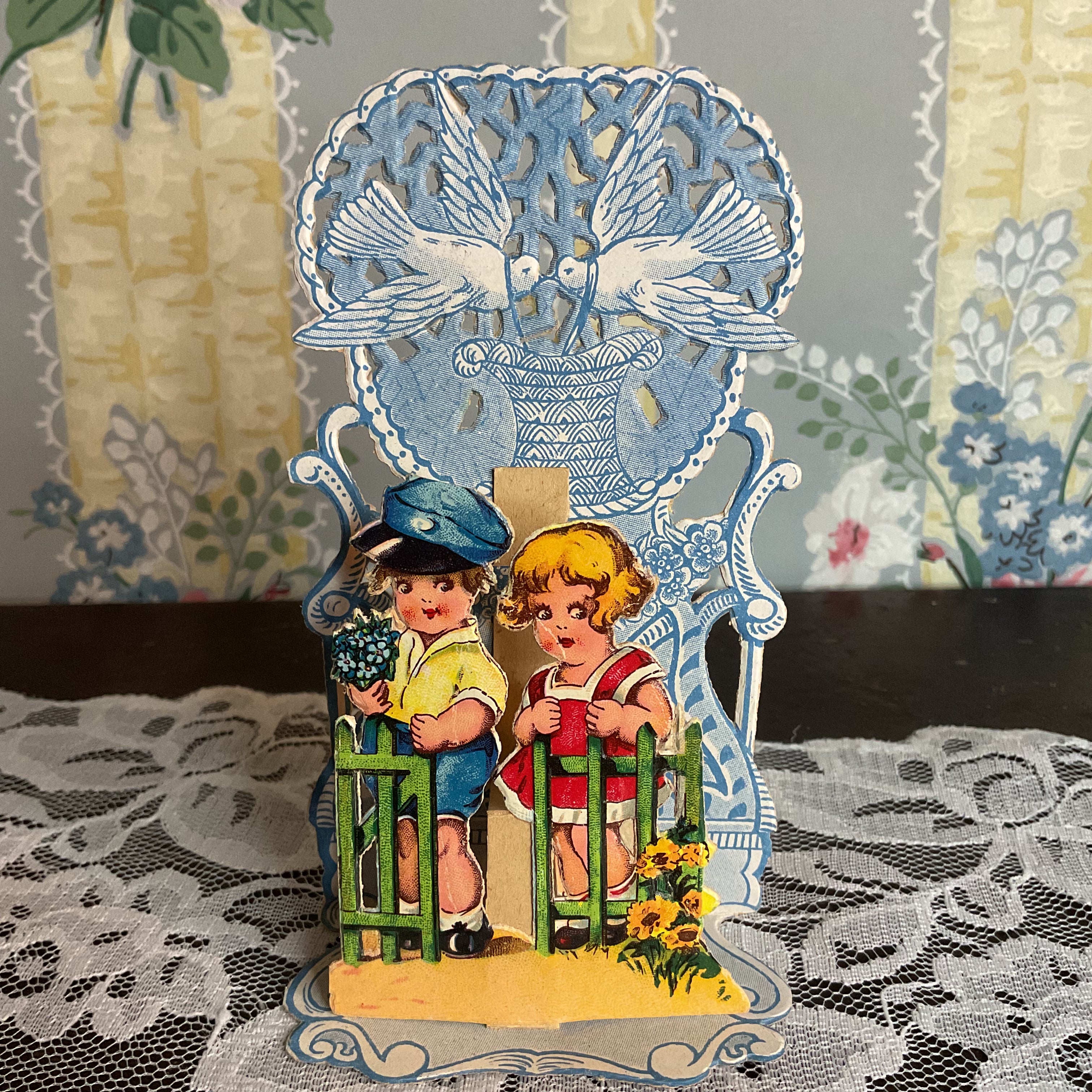 Vintage original 1930s die cut embossed 3D pop up Valentine Card. Features a young boy and girl. Boy is holding a bouquet of blue flowers. Background has two white doves on a lattice looking blue background.