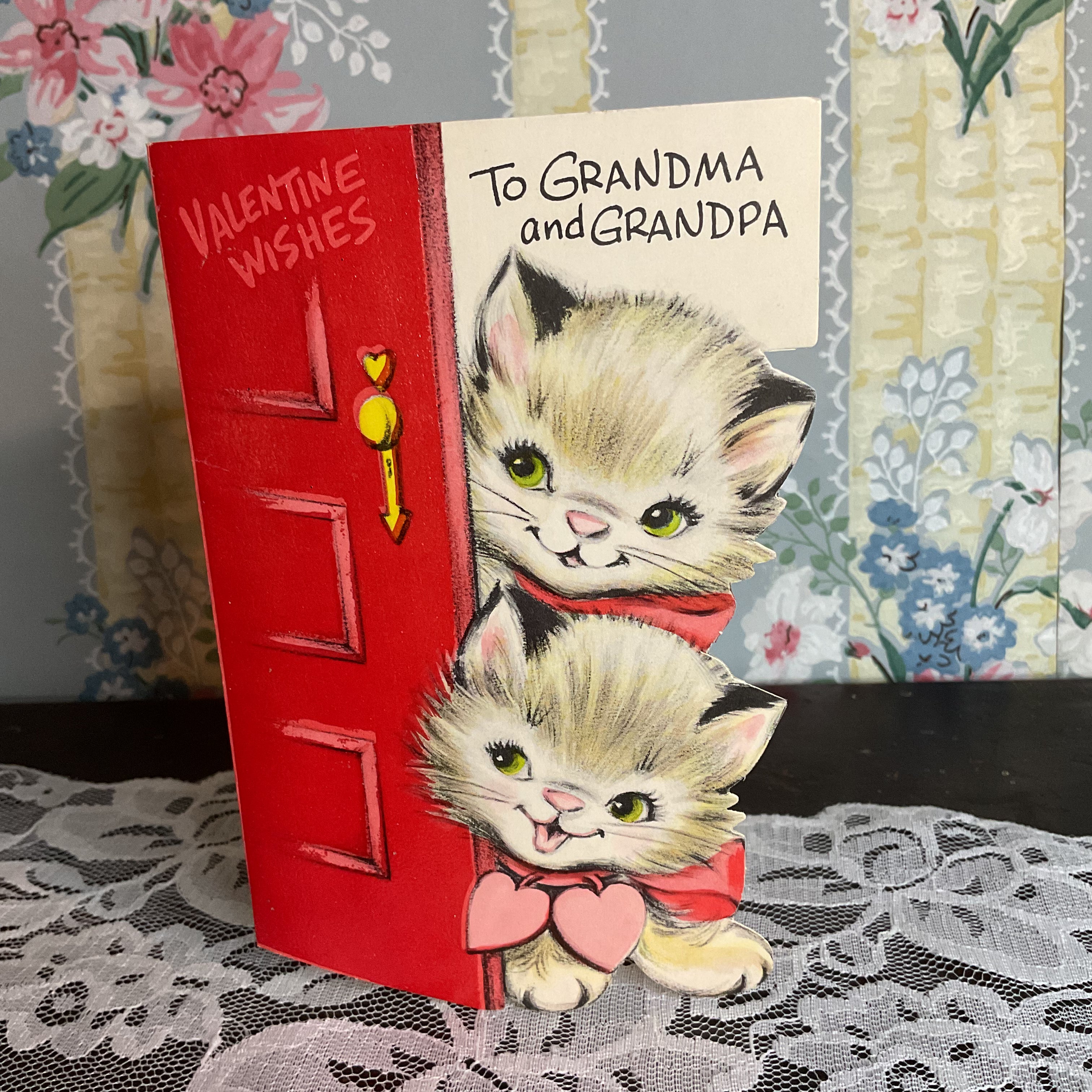 Vintage original circa 1960s Valentine Card. Features a young boy and girl. Features two white and gray kittens peeking out from behind an open door.
