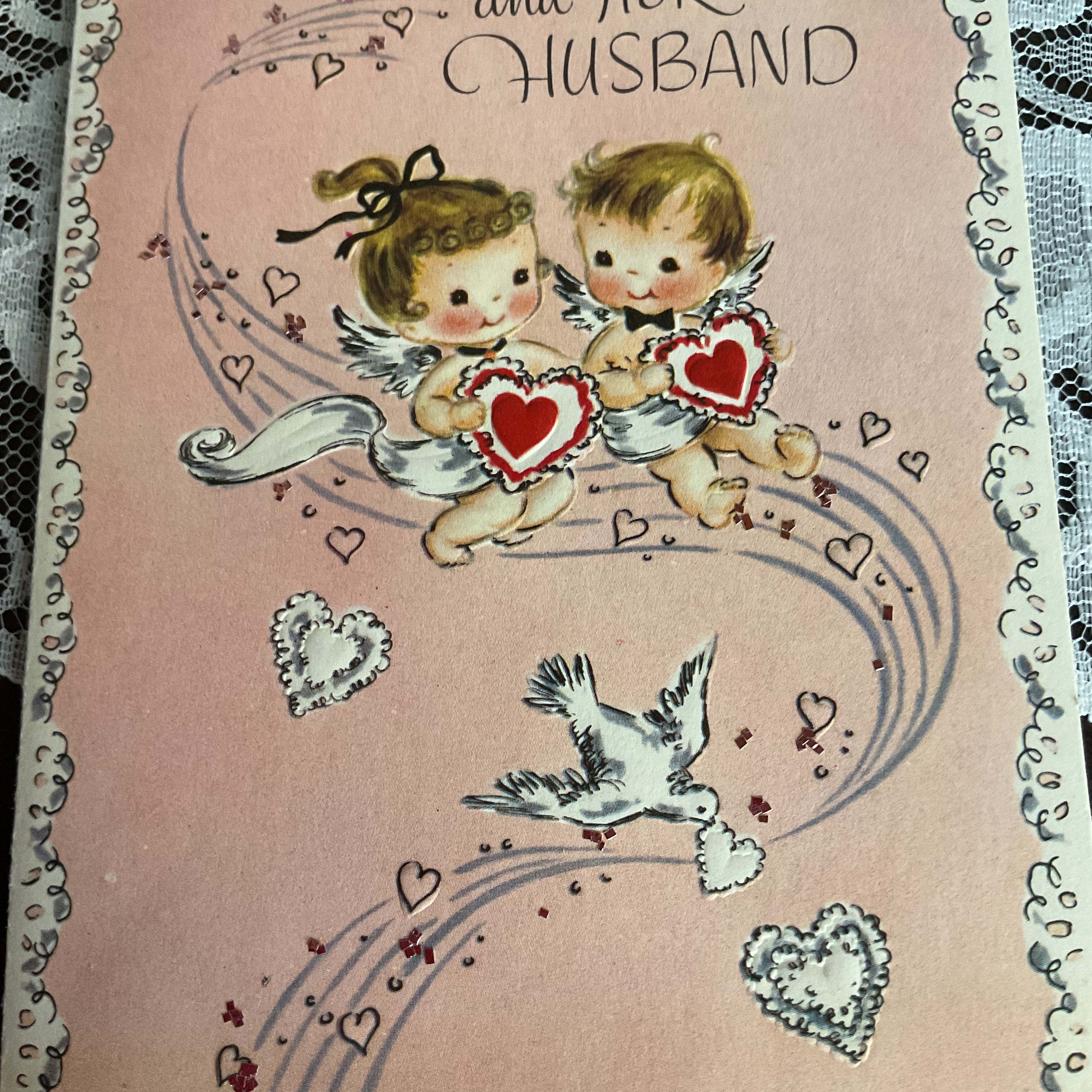 Vintage original circa 1960s embossed and glittered Valentine Card. Features a young boy and girl angel. Both are holding a little red and white heart Valentine.