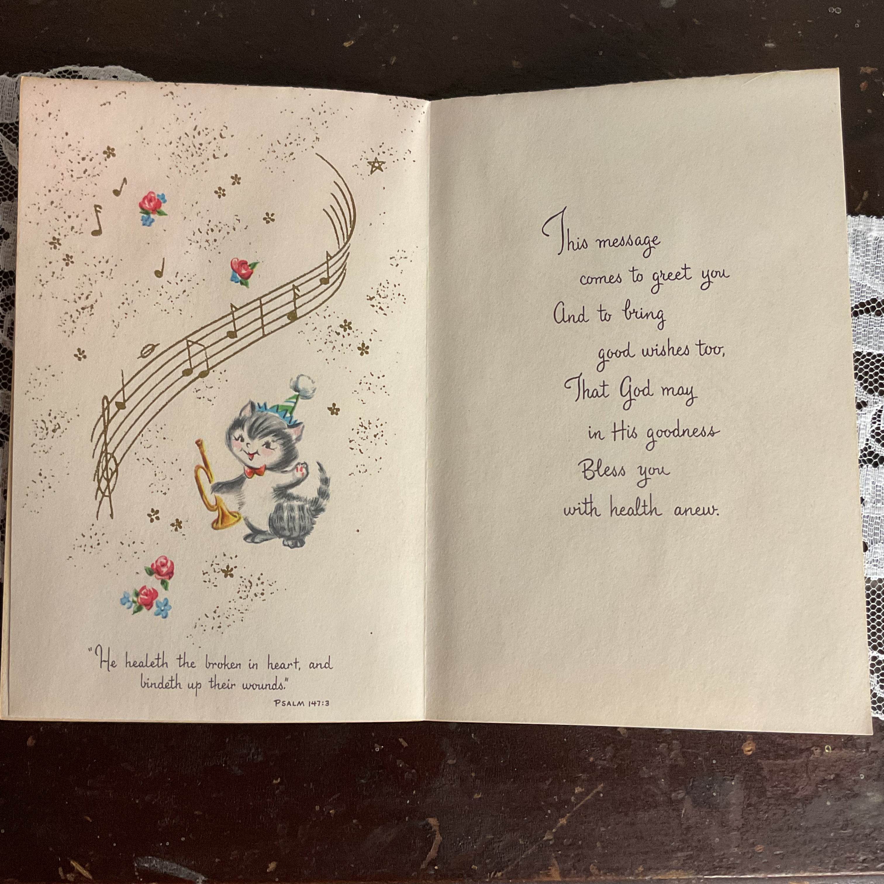 Vintage original 1950s Get Well Greeting Card. Features an adorable gray kitten playing a bugle. Kitten is surrounded by pink roses, gold musical notes and small blue flowers that are glittered.