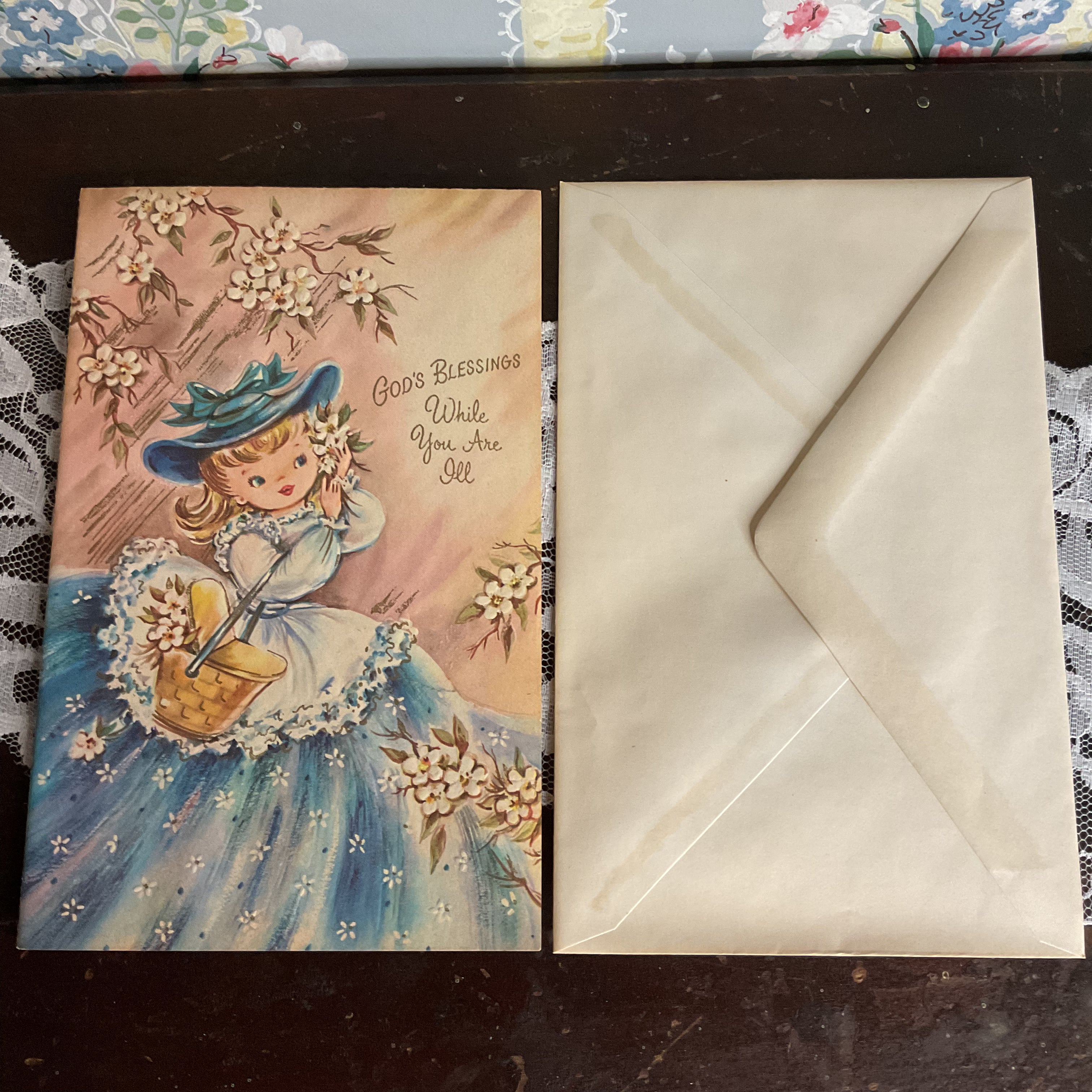 Vintage original circa 1950s Get Well Greeting Card. Features a sweet little girl in a glittery blue dress. Girl is holding a basket full of flowers.
