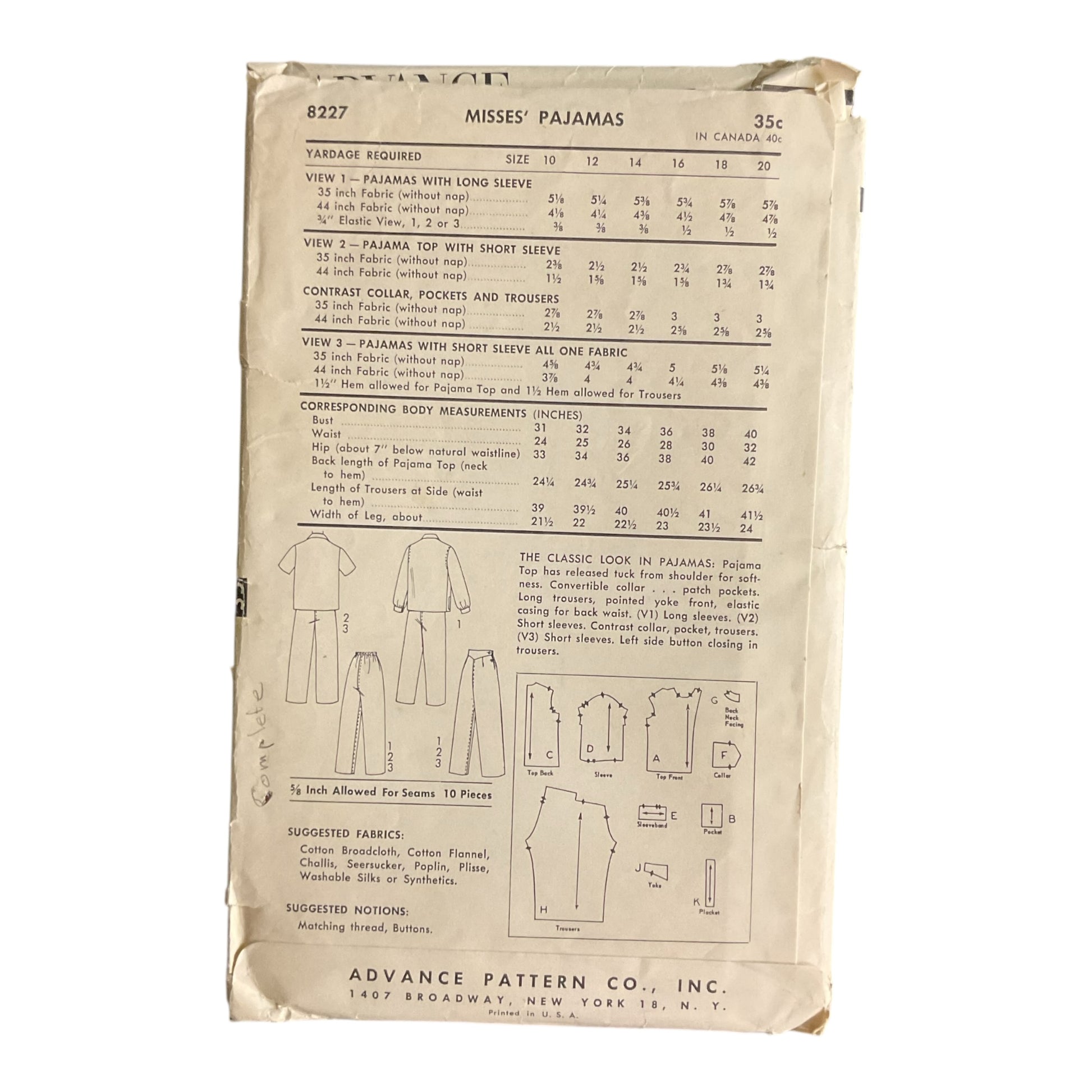 Vintage 1950s Misses' Pajamas Advance Sewing Pattern 8227 Bust 32 Waist 25