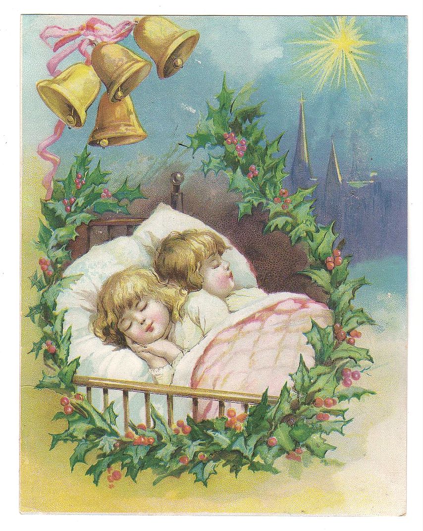 Shows an adorable boy and girl, in bed, dreaming of Christmas day.