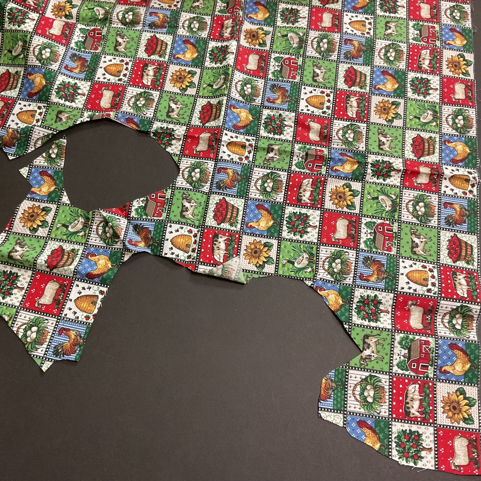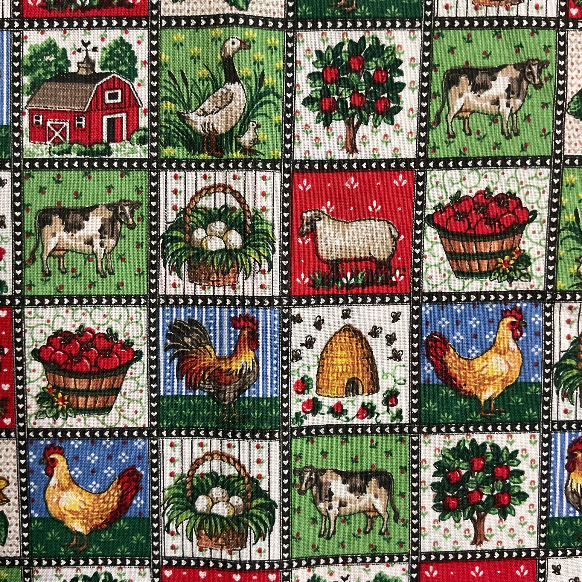 Fun country themed fabric featuring small 1 1/2” squares with various farm related items. Basket of apples, chicken, pig, basket of eggs, sunflower, bee hive, barn, goose, cow, apple tree and sheep.