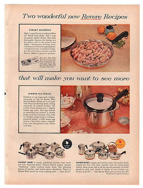 Vintage 1960 print ad for Revere Ware Cookware. Shows a copper bottom frying pan. Also shows a variety of the Patriot Ware pots and pans, and more Revere Ware at the bottom. Includes a recipe for Shrimp Meuniere and Ginger Ice Cream. Reads, "Two wonderful new Revere Recipes that will make you want to see more."