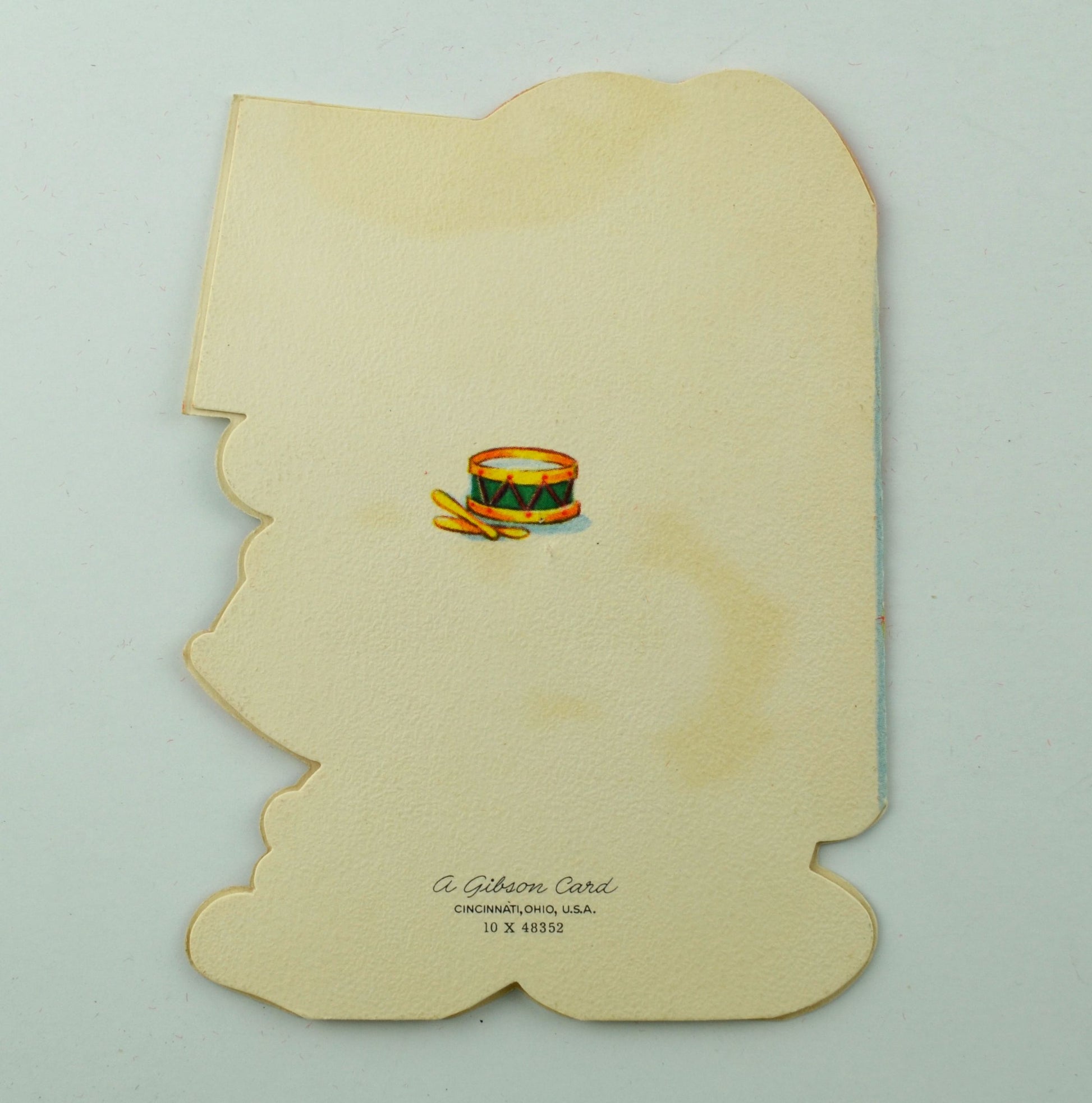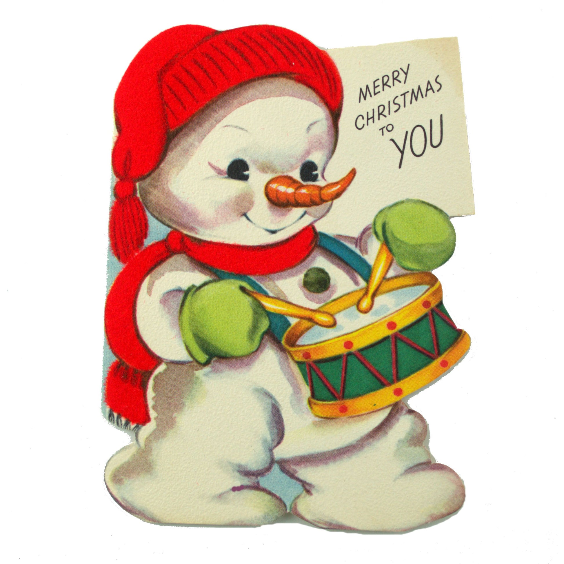 Vintage 1950s Flocked Christmas Greeting Card. Features a snowman boy playing a drum.