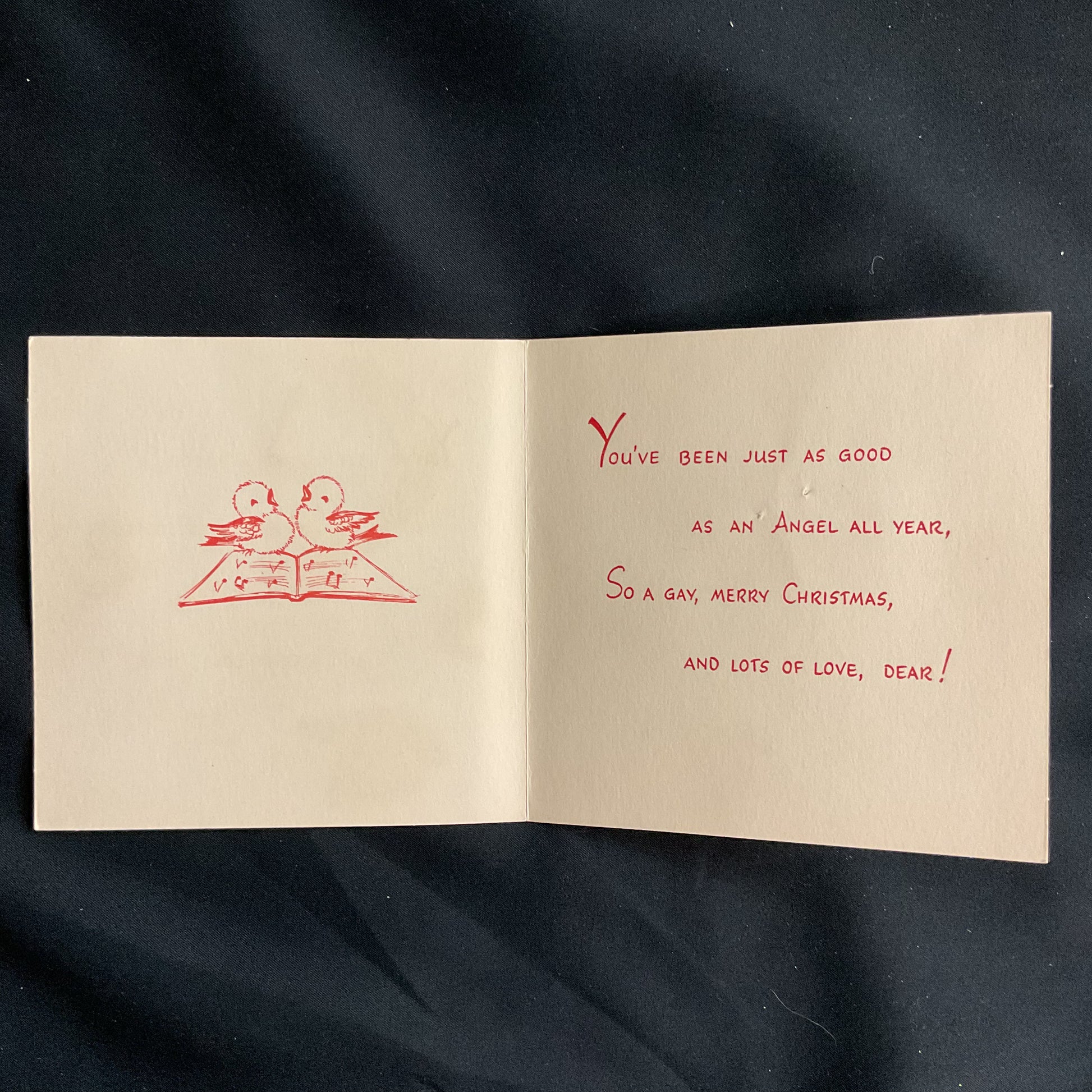 Vintage 1950s Christmas Greeting Card. Features a little angel holding a book, and singing. Also features two little red birds.