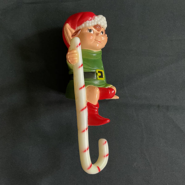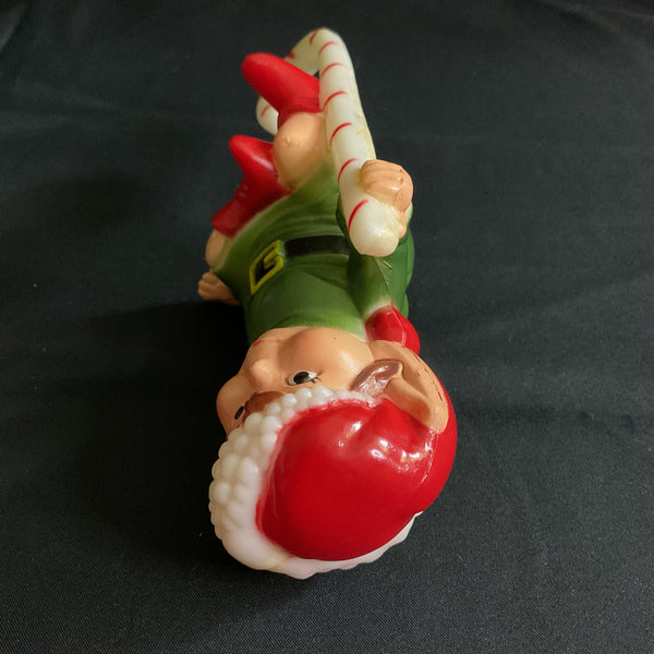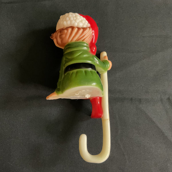 Hard plastic elf, wearing a green suit, black belt, red boots and a red hat. He’s also holding a candy cane.